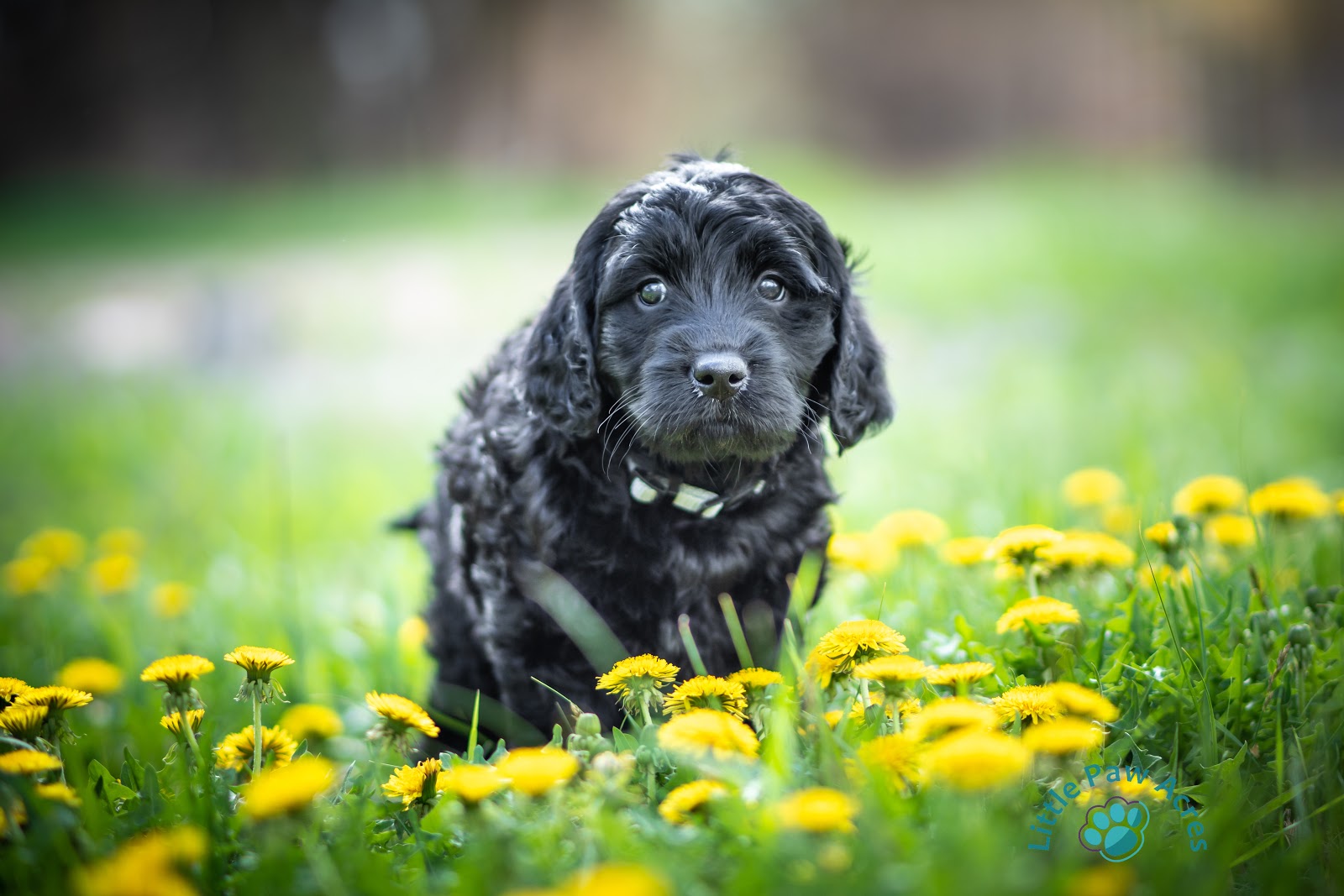 Little Paw Acres Goldendoodles are soft, cuddly, fluffy, curly, playful, and adorable! We're so blessed to get to photograph them! It was a partly cloudy spring day, the day after a healthy rainstorm, and the dandelions were in full bloom. What a perfect setting for puppy pics!